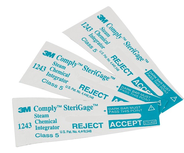 Integrating chemical indicator. Provides a response parallel to the biological indicator. It is a tablet that moves through the window to the acceptance zone.