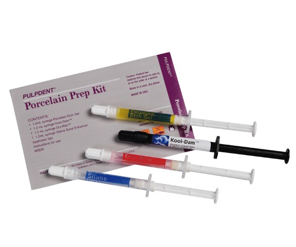 Porcelain preparation kit containing the necessary elements to prepare porcelain veneers and inlays, as well as to cement fractured porcelain teeth. CONTENTS: 1 bottle x 12 ml porcelain etching gel (96% hydrofluoric acid) + 2 bottles x 12 ml drying agent (alcohol) + 1 bottle x 12 ml bonding agent (silane) + 4 tips + 4 needles.