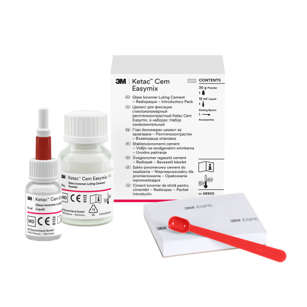 Cemento vidrio ionómero para cementaciones prótesis fija bandas ortodoncia pernos etc. Radiopaco grosor de película 15 M. Biocompatible adhesión química en esmalte y dentina baja solubilidad sin contracción. Nueva fórmula granulada. Más fácil de mezclar. CONTENIDO : 1 frasco polvo 30 g.1 líquido 12 ml. y 1 bloque mezcla.