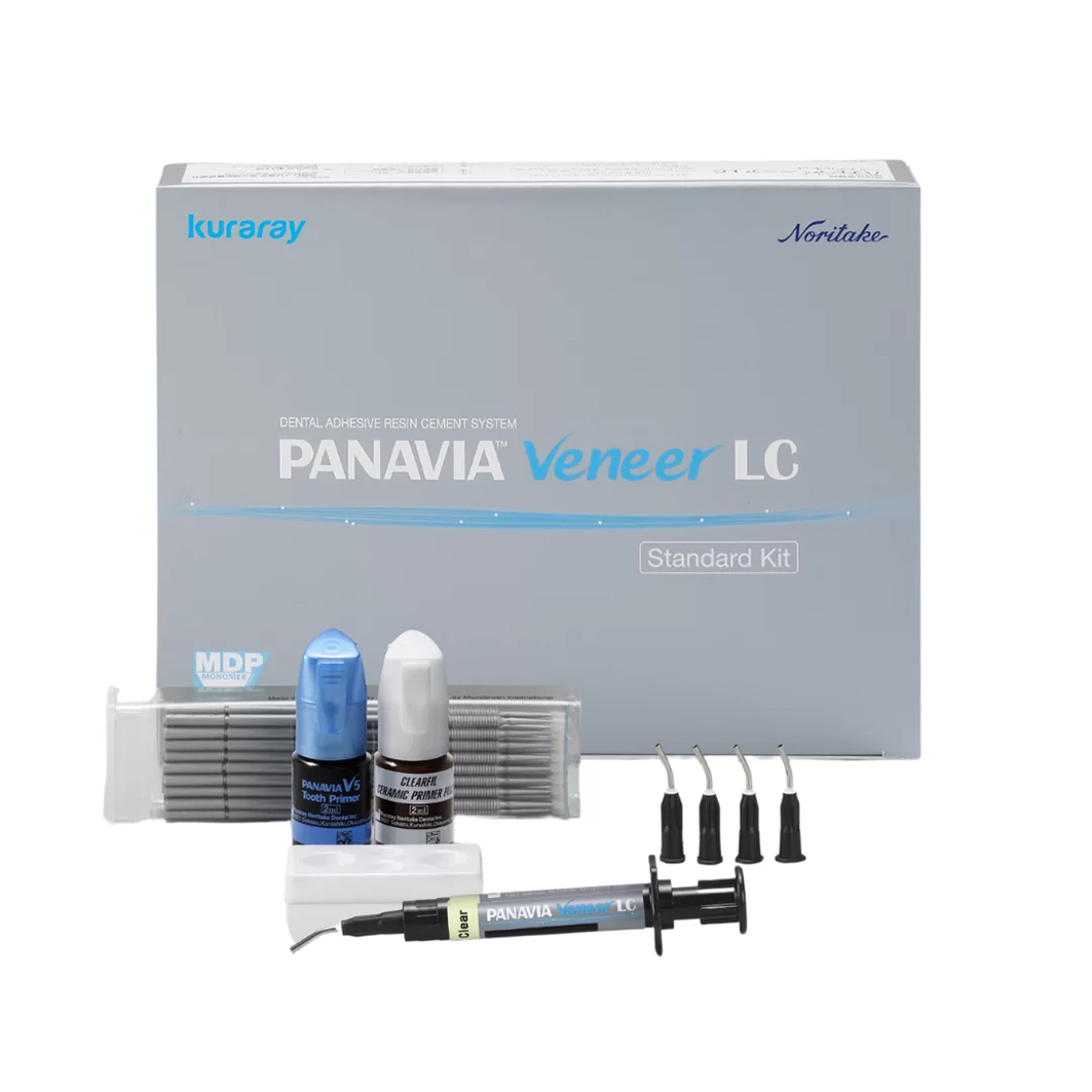 PANAVIA Veneer LC is a light-curable adhesive resin cement system. It consists of PANAVIA Veneer LC Paste (a light-curable cement paste), CLEARFIL CERAMIC PRIMER PLUS (a silane primer for zirconia and metal), K-ETCHANT Syringe (phosphoric acid), and PANAVIA V5 Try-in Paste. For tooth treatment, PANAVIA V5 Tooth Primer or CLEARFIL Universal Bond Quick can be used. The cement paste is a light-curable resin-based material that provides color stability and radiopacity equal to or greater than 1 mm of aluminum. It is supplied in Kuraray's ergonomic syringe and is dispensed into an inlay cavity or onto an onlay or a veneer using a bent applicator tip (16G). It is available in 4 color shades: Universal (A2), Clear, Brown (A4), and White. It is classified as type 2 material and class 2 (group 1) according to ISO 4049. Before cementation, color adaptation can be checked with PANAVIA V5 Try-in Pastes. II. INDICATIONS Cementation of ceramic and composite inlays, onlays, and veneers with a thickness of less than 2 mm.