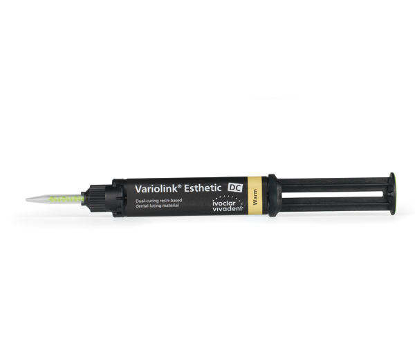 Dual-cure (DC) and light-cure (LC) composite for the permanent cementation of ceramic and composite restorations. It is inspired by the aesthetic cementation composites Variolink II and Variolink Veneer. It features exceptional color stability thanks to the patented photoinitiator Ivocerin, which is completely free of amine-based co-initiators. Variolink Esthetic provides the foundation for durable and reliable aesthetic results. It is not subject to visible changes in its fluorescence color, which closely resembles that of natural teeth.