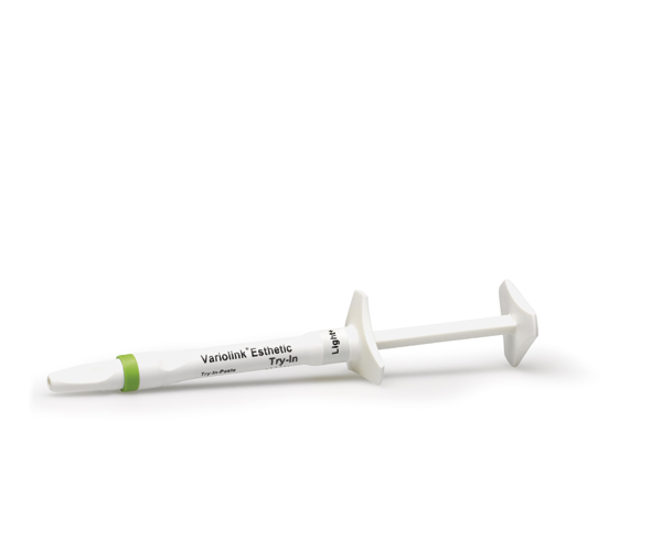 Dual-cure (DC) and light-cure (LC) composite for the permanent cementation of ceramic and composite restorations. Variolink Esthetic Try-in color testing paste is inspired by the aesthetic cementation composites Variolink II and Variolink Veneer. It features exceptional color stability thanks to the patented photoinitiator Ivocerin, which is completely free of amine-based co-initiators. Variolink Esthetic provides the foundation for durable and reliable aesthetic results. It is not subject to visible changes in its fluorescence color, which closely resembles that of natural teeth.