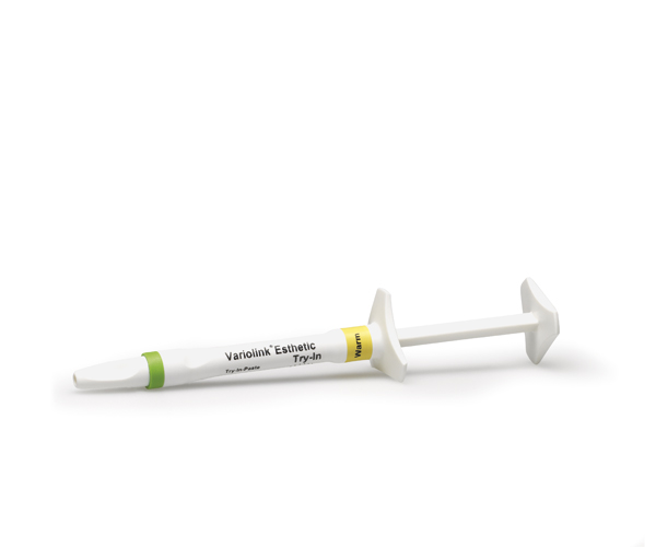 Dual-cure (DC) and light-cure (LC) composite for the permanent cementation of ceramic and composite restorations. Variolink Esthetic Try-in color testing paste is inspired by the aesthetic cementation composites Variolink II and Variolink Veneer. It features exceptional color stability thanks to the patented photoinitiator Ivocerin, which is completely free of amine-based co-initiators. Variolink Esthetic provides the foundation for durable and reliable aesthetic results. It is not subject to visible changes in its fluorescence color, which closely resembles that of natural teeth.