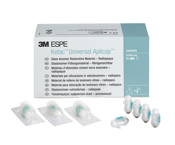 Restaurador Ionómero de vidro Ketac™ Universal Aplicap™. Poupa tempo e aumenta a resistência. Menos passos, maior número de indicações e manuseio mais simples. Reduz o tempo dos tratamentos com restaurações em um só passo. Não necessita de condicionador nem camada protetora. Bulk Fill sem necessidade de colocação em camadas. Permite soluções restauradoras rápidas e resistentes em apenas um passo. Faixa de indicações superior a outros ionómeros de vidro. Baixa pegajosidade que facilita a colocação. Liberação contínua de flúor durante 24 meses. Autoadesivo. Disponível em 6 cores. Radiopaco. Composto por 10 unidades brancas, 10 unidades A2 e 10 unidades A3.
