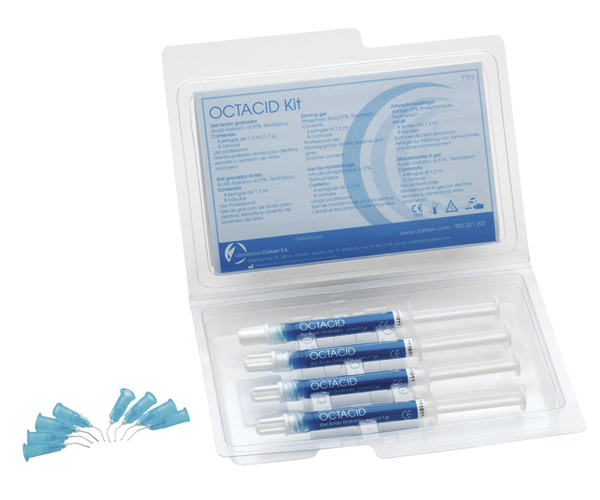 Octacid is a high-quality etching gel with a viscosity specially designed for optimal performance and handling characteristics. It is thixotropic and therefore does not spill onto the tooth or exposed tissue. It is formulated to rinse off completely and easily without leaving any residue. Dentin and enamel are etched in 15 to 20 seconds. The curved needles provide precise placement of the material on dental surfaces. Phosphoric acid 37%. 4 syringes of 1.5 ml + 8 cannulas.