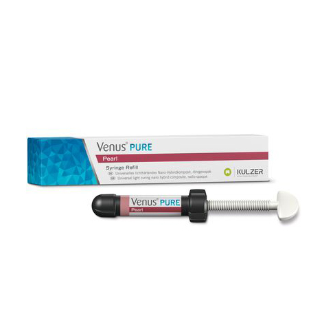 Photopolymerizable nanohybrid composite. Excellent radiopacity. Indicated for anterior and posterior restorations. Exceptional physical properties; the innovative Venus Pearl matrix offers incredible flexural strength and minimal shrinkage stress, resulting in reduced chipping, wear, and secondary caries over time. Easy and comfortable handling due to its creamy and stable consistency. Does not stick to instruments. Provides an extended working time and a high-gloss polish. BPA-free. Venus Pearl Pure Shades, colors for monochromatic layering: MEDIUM, LIGHT, DARK, BLEACH, ONE. Venus Pearl Art Shades, colors for polychromatic layering: A1, A2, HKA2.5, A3, A3.5, A4, HKA5, B1, B2, B3, C1, C2.