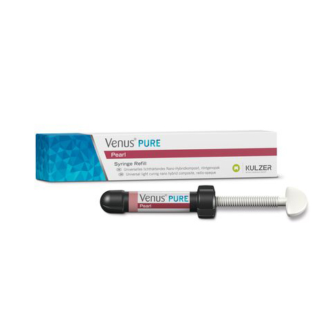 Photopolymerizable nanohybrid composite. Excellent radiopacity. Indicated for anterior and posterior restorations. Exceptional physical properties; the innovative Venus Pearl matrix offers incredible flexural strength and minimal shrinkage stress, resulting in reduced chipping, wear, and secondary caries over time. Easy and comfortable handling due to its creamy and stable consistency. Does not stick to instruments. Provides an extended working time and a high-gloss polish. BPA-free. Venus Pearl Pure Shades, colors for monochromatic layering: MEDIUM, LIGHT, DARK, BLEACH, ONE. Venus Pearl Art Shades, colors for polychromatic layering: A1, A2, HKA2.5, A3, A3.5, A4, HKA5, B1, B2, B3, C1, C2.