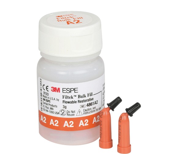 Filtek Bulk Fill Composite is ideal for quick and easy posterior restorations. Key features: 4 mm curing depth, reduced stress and shrinkage, superior strength and lower wear compared to other Bulk Fill composites, high radiopacity. Available in 4 shades (A1, A2, A3, and Universal) in both syringes and cartridges.