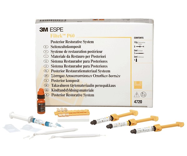 Filtek P60 posterior restorative offers ideal handling defined by customers, featuring an easy application technique and superior physical properties that include high strength, excellent wear resistance, and very low shrinkage. Filtek P60 is indicated for use in direct and indirect restorations in the posterior sector. CONTENTS: 3 syringes x 4 g (A3 B2 C2) + 3 ml bottle of Adper Scotchbond 1 Adhesive + 1 syringe x 3 ml Scotchbond Etching Gel + Accessories.