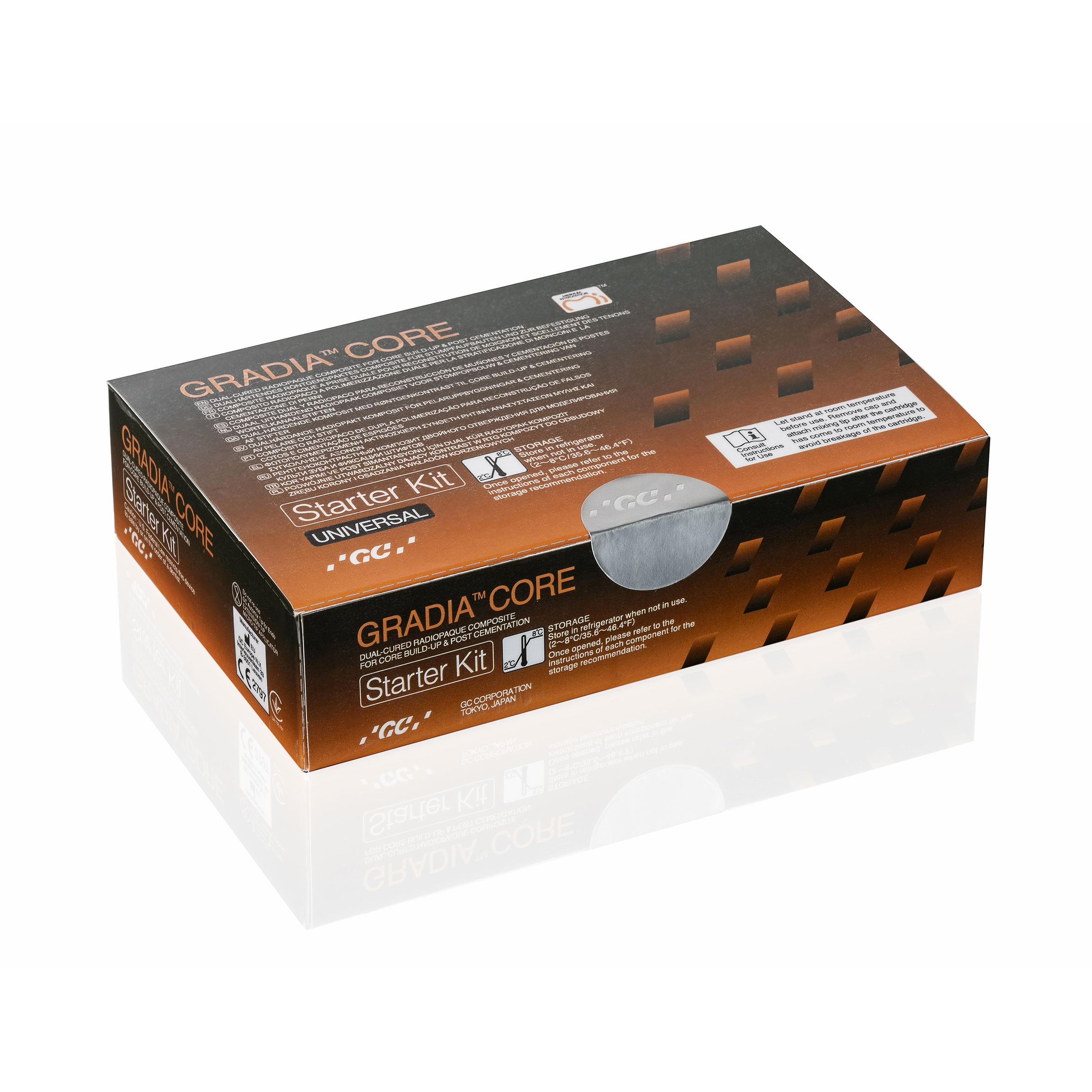 Composite dual Gradia Core para reconstrução de muñones e cimentação. Conteúdo: cartucho GRADIA CORE 10 m (20g), 1 G-Premio BOND 5 ml, 1 G-Premio BOND DCA 3 ml, 20 pontas Automix, 20 pontas de extensão endo e acessórios.