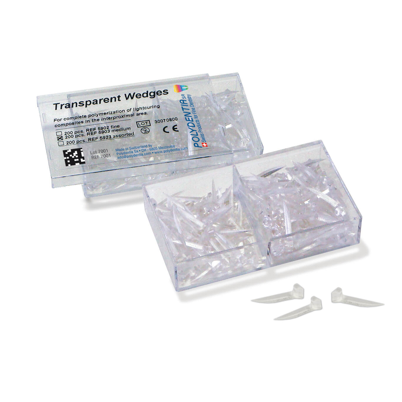 Cunhas transparentes de policarbonato anatómicas, para melhor introdução. Excelente textura e flexibilidade, garantindo uma polimerização completa da restauração.