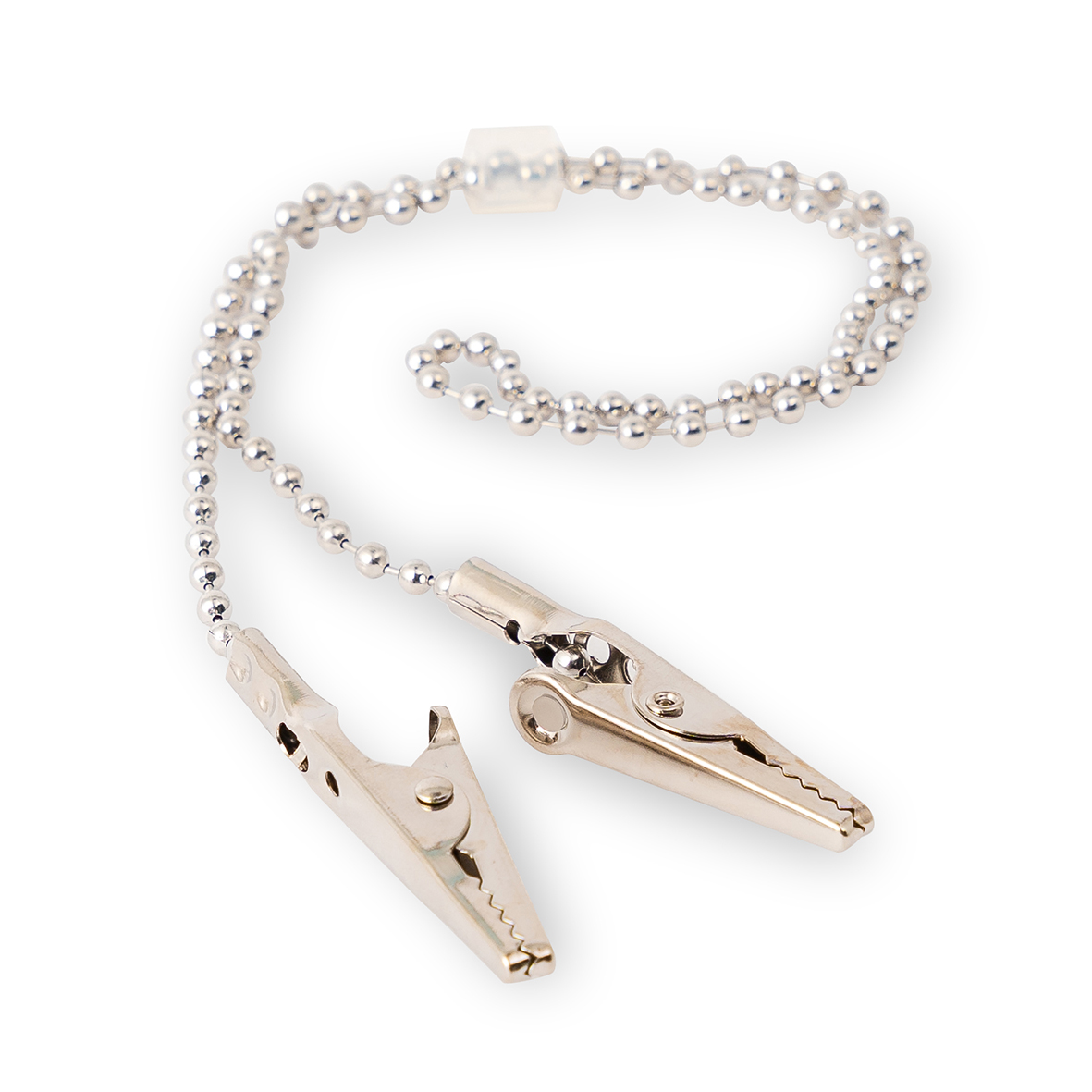 Pinças para segurar baberos na clínica dentária. Fabricadas em cromo prata e com fecho.