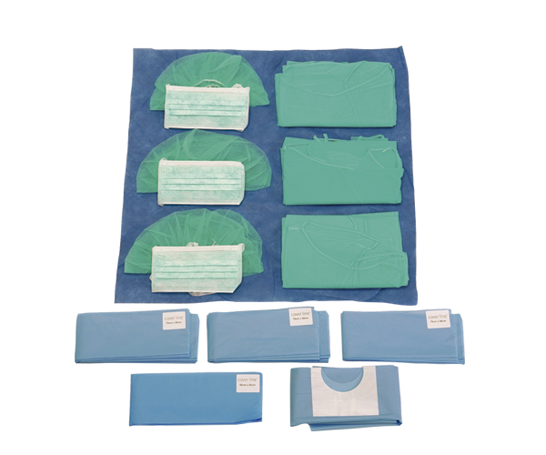 Composition: 1 Non-adhesive surgical drape (L) 75cm x 100cm, 2 Non-adhesive surgical drapes (L) 50cm x 62.5cm, 1 Non-adhesive fenestrated surgical drape (IS) 50cm x 60cm, 3 Tie-back masks, 3 Protective gowns (PP-28/30 g) with cuffs, 1 Surgical cap with ties, 2 Nurse caps with elastic back. Wrapped in SMS cloth 60cm x 60cm.