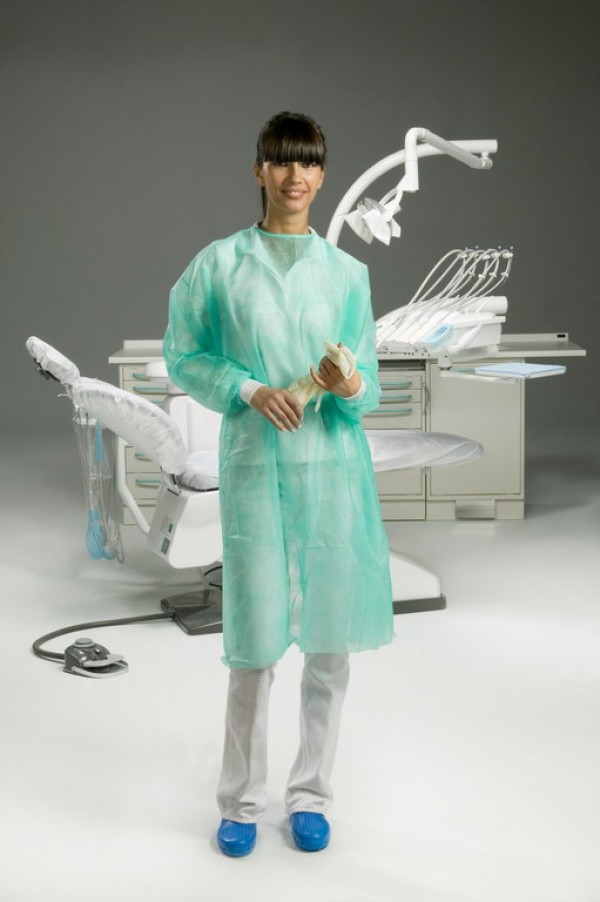 Disposable sterile gown made of non-woven fabric, with OMNIA cuffs. Hydro-repellent "SPUNBOND" gown with cotton cuffs. Suitable for brief routine practice, second surgical phase, and as a complement to patient protection. Non-woven fabric 30 g/m². One size. Individually packaged.