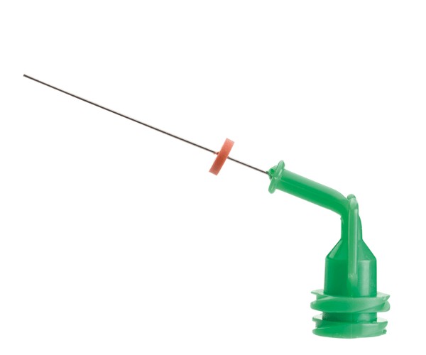 Plastic body with angled neck and very fine metal cannula. The apical end of the tip is soft and flexible, while the rest of the length is rigid, facilitating smooth insertion into the root canal without bending. For applying solutions and gels, such as File-Eze, EDTA 18%, Citric Acid 20%, Ultra-Etch, and sodium hypochlorite. 30ga diameter 0.30 mm.