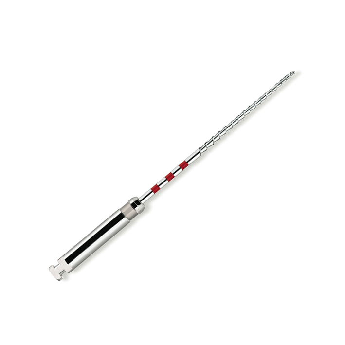 Stainless steel condenser, similar to an inverted Hedstrom file for CA, low speed, placed between the gutta percha cone and the wall of the canal, it rotates to frictionally heat the gutta percha, compacting it apically.