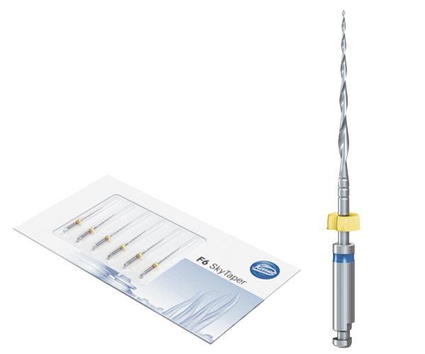 Skytaper F6 instruments, perfection with everything you need. Root canal preparation in rotary mode with an instrument featuring a taper of 06. Five sizes to prepare all root canal anatomies. Flexibility and efficiency thanks to the intelligent design of the files. Disposable files in sterilized packaging.
