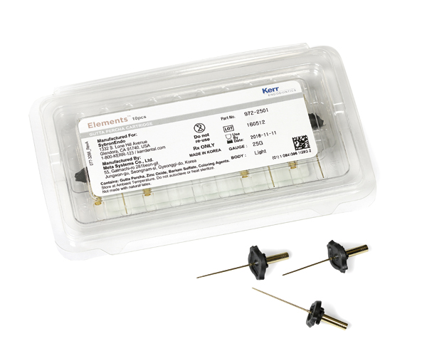 Cartridges for Elements gutta-percha, compatible with the Elements Free and Elements Obturation systems. The next-generation cartridge has been redesigned to extrude 7% more gutta-percha. Each cartridge contains enough gutta-percha to obturate up to four canals. The new cannula is 5 mm longer and more flexible, providing greater capacity to reach the working length of the canal. The exclusive copper and gold coating conducts heat more efficiently, reducing the risk of the gutta-percha losing heat as it passes through the needle into the root canal chamber.