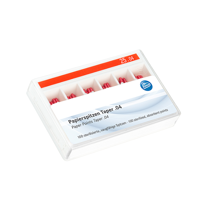 Paper points with a taper of 04, size 040, and depth graduation. Color-coded with a length of 28mm.