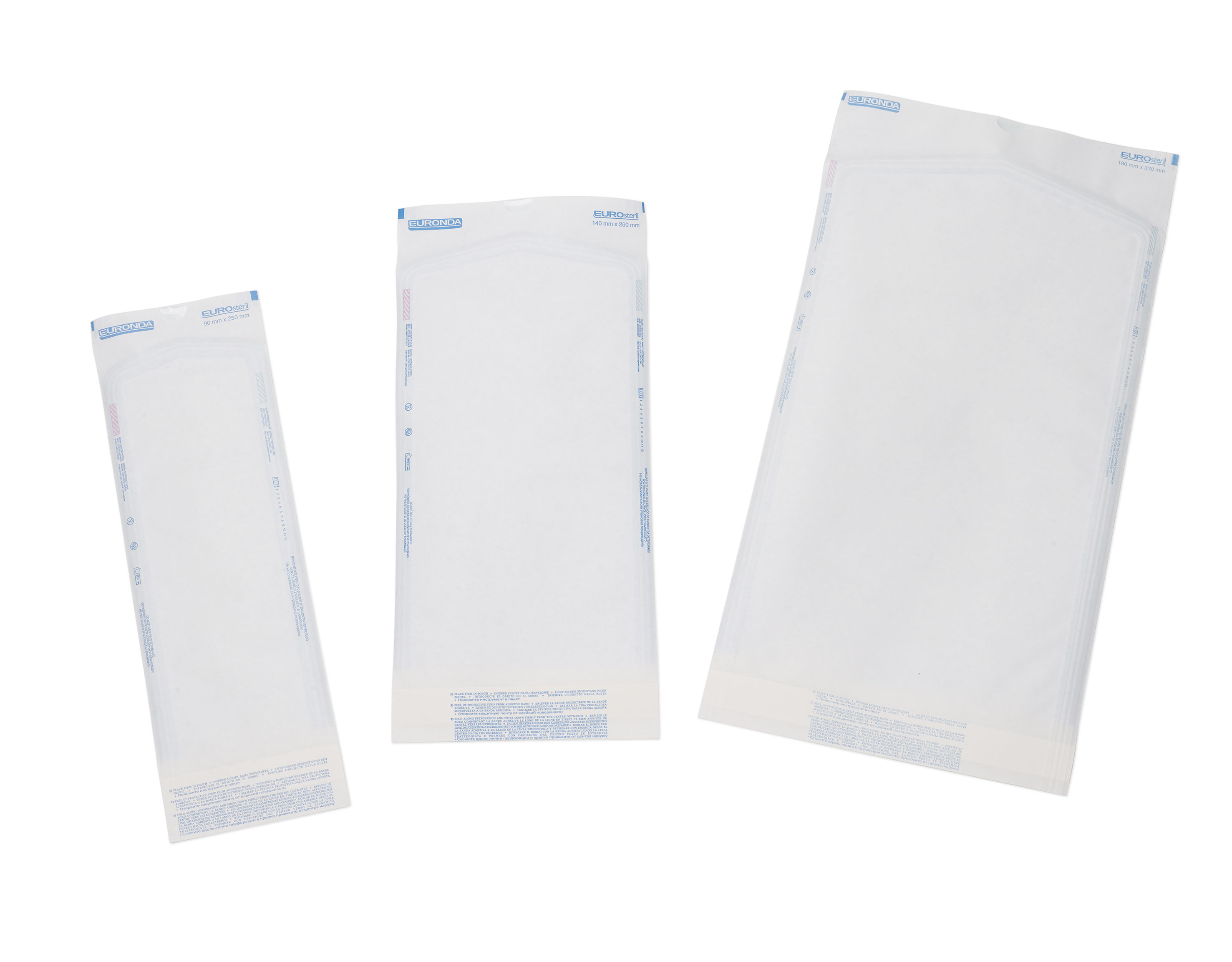 Bolsas para esterilização de papel médico de alto gramagem (60g/m²) e dupla camada de película celeste em poliestireno/polipropileno. Três soldaduras laterais de canais impermeáveis e homogéneos para a máxima proteção microbiana. Dotadas de indicadores químicos de viragem para esterilizações a vapor ou de gás EtO (óxido de etileno). Adequada pelabilidade sem emitir fibras de papel ou rasgamento do papel ao abrir o invólucro. Completamente conforme com a diretiva 93/42/CEE (e posterior emenda 2007/47/CE) e a norma EN-868-1.
