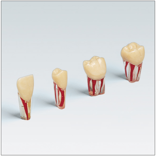 Model tooth with root canals for the AG-3 series, screwable, with a transparent root, ivory-colored crown made of duroplastic material, and hollow root canals dyed red. Harder material and improved canal conformity compared to AG3ZPUK for optimal instrumentation. For root canal treatment exercises and cavity preparation in preclinical training.