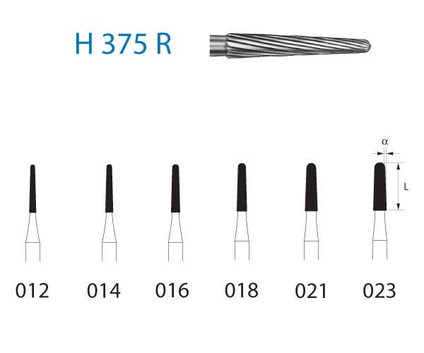 H375R.314.014 CARBIDE CLINICAL FINISH ISO: 102 - Maximum Speed: 300,000 rpm - Shape: ROUND CONICAL Diameter 014 - Turbine Shank 0 Grain Type: 0 - Application: Polishing Crown Preparations - Packaging Quantity: 5 pcs