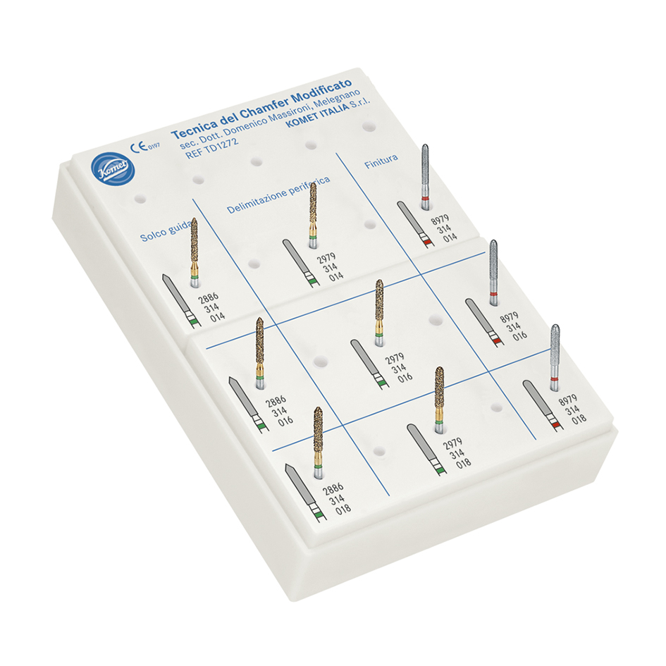 BUR FOR THE PREPARATION OF MODIFIED CHAMFER, ACCORDING TO DR. DOMENICO MASSIRONI, COMPOSED OF 6 TORPEDO-SHAPED BURRS, COARSE GRIT FROM THE 2000 SERIES, AND 3 FINE GRIT BURRS FOR FINISHING.