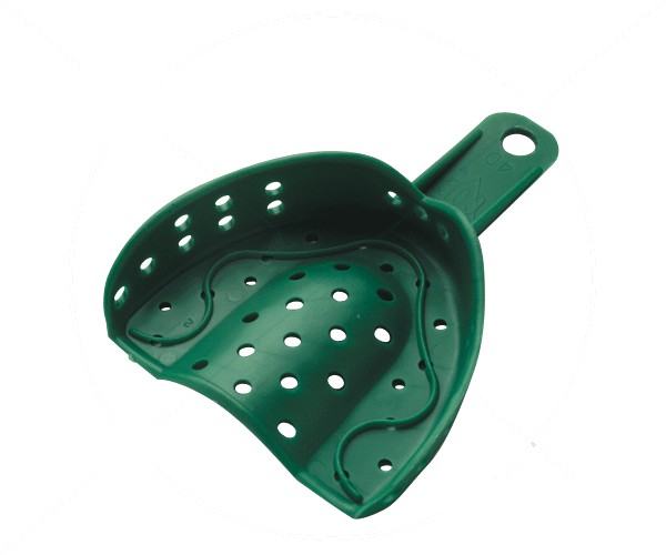 These are the only disposable trays with a specific anatomical design, allowing for greater space for impression material in critical areas such as the contact between cusps and the tray for a more accurate impression. Green color.