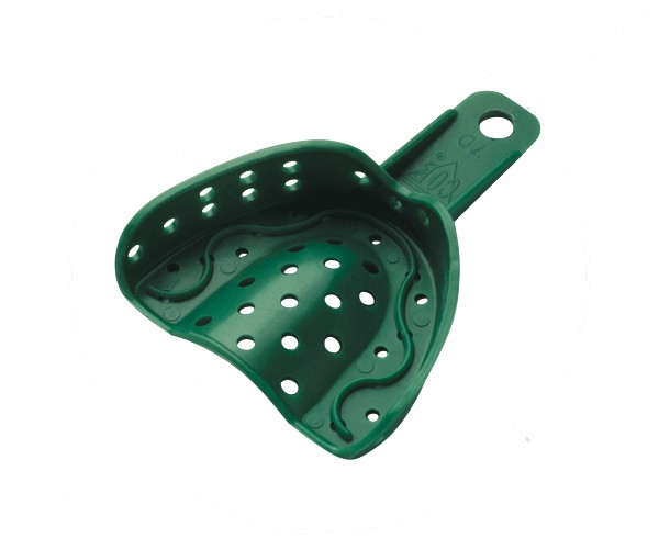These are the only disposable trays with a specific anatomical design, allowing for greater space for impression material in critical areas such as the contact between cusps and the tray for a more accurate impression. Color: green.