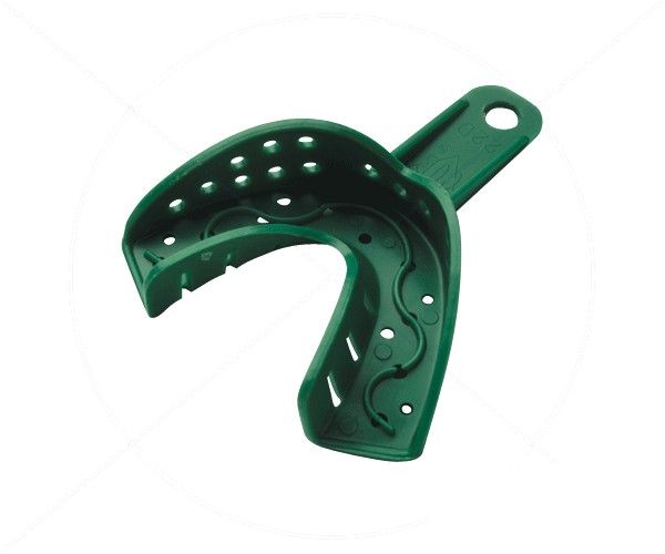 These are the only disposable trays with a specific anatomical design, allowing for greater space for impression material in critical areas such as the contact between cusps and the tray for a more accurate impression. Green color.