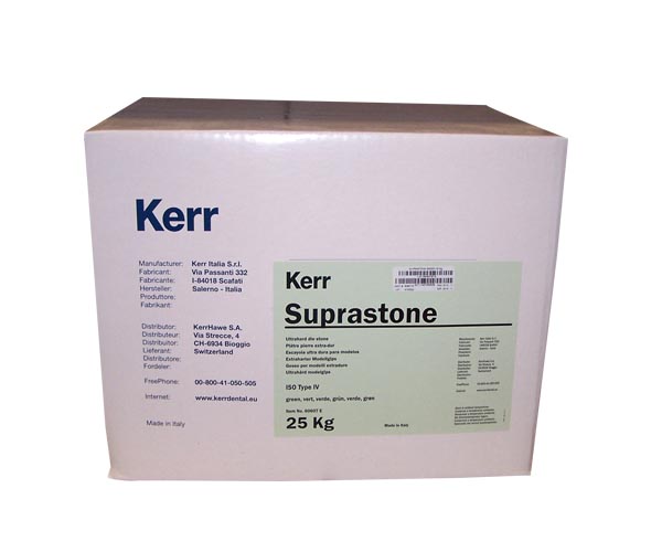 High-quality plaster designed to produce crown and bridge models with a hard and smooth surface. Suprastone has a very high compressive strength and is not brittle. It is precise and fluid during the process of pouring a model. Type IV, green color.