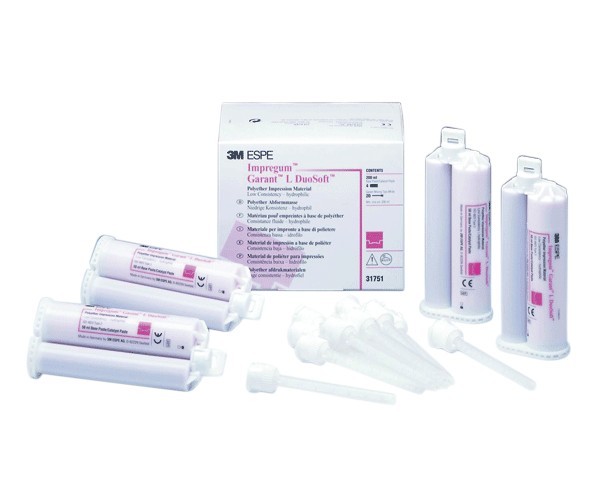 Polyether for impression taking for the monophase technique (manual mixing version). Indications: Impressions for crowns and bridges, impressions for inlays and onlays, functional impressions, drag impressions, implant impressions. CONTENT: 2 x 120 ml of base + 2 x 15 ml of activator + mixing block. CONTENT: 4 cartridges of 50 ml + 20 white mixing tips + 5 intraoral syringes.