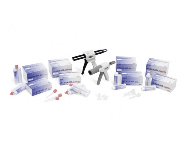 Addition silicone specially developed for bite registration. Comfortable application - No resistance to occlusion or very hard final setting - Does not bounce back on the working model - Cuts perfectly, not brittle - Fast setting for full arch registration - Super Fast setting for half arch registration - Blue color. CONTENTS: 4 cartridges x 50 ml + 12 mixing tips + 12 spreader tips