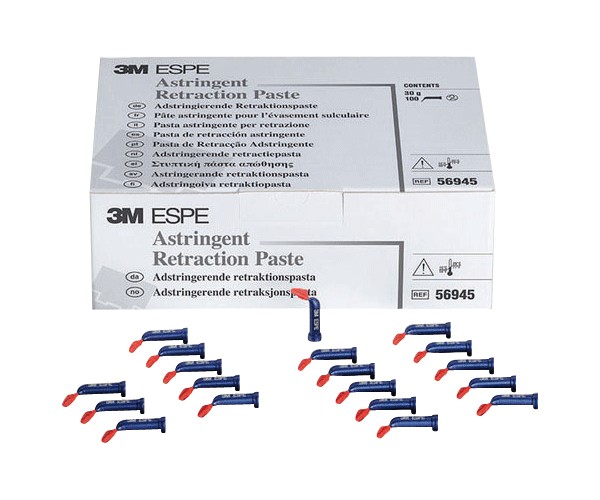 The astringent retraction paste from 3M ESPE is indicated for the temporary retraction of the gingival margin to provide a dry sulcus when the periodontal tissue is healthy, such as during impression taking (on substrate material or digital). Preparation of temporary casts. Preparation of Class II and V restorations. The product should not be used in patients with conditions involving open furcation periodontal tissue or exposed bone.