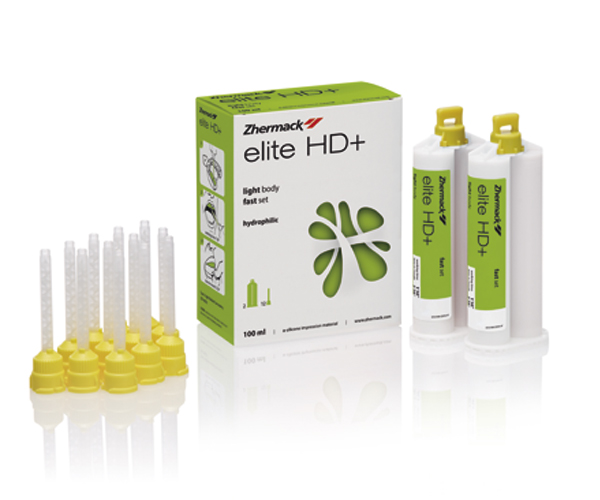 Elite HD+ for Putty/Wash Monophase or Heavy/Light techniques. Thanks to nanotechnology, it reaches inaccessible areas of the gingival sulcus. Ideal balance between working time and setting time (Snap-set effect). Thixotropic, does not drip during impression taking - neutral taste. Soft putty - easy mixing - does not compress tissues and fluid is easily removed from the mouth. Available in packaging for automatic mixing machines. Rated by Dental Advisor - Excellent ++++1/2. Total working time Fast Set 130 minutes - Normal Set 230 minutes / Retention in the oral cavity Fast Set 230 minutes - Normal Set 330 minutes.