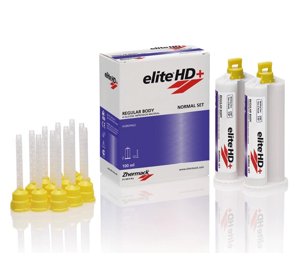 Elite HD+ for Putty/Wash Monophase or Heavy/Light techniques. Thanks to nanotechnology, it reaches inaccessible areas of the gingival sulcus. Ideal balance between working time and setting time (Snap-set effect). Thixotropic, does not drip during impression taking - neutral taste. Soft putty - easy mixing - does not compress tissues and fluid is easily removed from the mouth. Available in packaging for automatic mixing machines. Rated by Dental Advisor - Excellent ++++1/2. Total working time Fast Set - 130 minutes - Normal Set 230 minutes / Retention in the oral cavity - Fast Set 230 minutes - Normal Set 330 minutes.