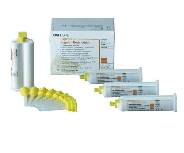 3M ESPE presents the next generation of vinyl polysiloxanes (VPS) for impression taking using one or two-step techniques. The new Express™ 2 impression materials, available in different viscosities, possess all the necessary characteristics for an excellent fit of the definitive restoration: they accurately capture the margin of the preparation and maintain their shape after being removed from the patient's mouth, with a recovery of nearly 100%. The new Express™ 2 product family offers a complete range of heavy and fluid silicones for automatic mixing with normal or fast setting. The fluid silicones of Express™ 2 are highly hydrophilic and exhibit excellent flow properties while maintaining sufficient resistance to overflow. CONTENT: 4 Express 2 Heavy Body Quick cartridges, 10 green mixing tips.