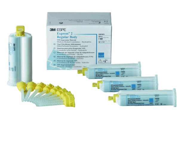 3M ESPE presents the next generation of vinyl polysiloxanes (VPS) for impression taking using one or two-step techniques. The new Express™ 2 impression materials, available in different viscosities, possess all the necessary characteristics for an excellent fit of the definitive restoration: they accurately capture the margin of the preparation and maintain their shape after being removed from the patient's mouth, with nearly 100% recovery. The new Express™ 2 product family offers a complete range of heavy and fluid silicones for automatic mixing with normal or fast setting. The fluid silicones of Express™ 2 are highly hydrophilic and exhibit excellent flow properties while maintaining sufficient resistance to overflow. CONTENT: 4 Express 2 Heavy Body cartridges of 50ml, 10 green mixing tips.