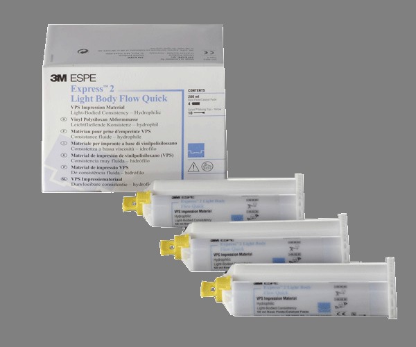 Express™ 2, the new generation of VPS from 3M ESPE, provides the ideal starting conditions for achieving maximum precision impressions and a great fit in indirect restorations. Available in a range of viscosities—from putty to ultra-flow—the Express 2 impression materials offer key advantages for one-step or two-step impression techniques. All heavy-body silicones in the Express 2 line are automatically mixed in the Pentamix unit. CONTENT: 4 cartridges of Express™ 2 Light Body Flow Quick, 50 ml each, 10 yellow Garant™ mixing tips, 1 instruction manual.