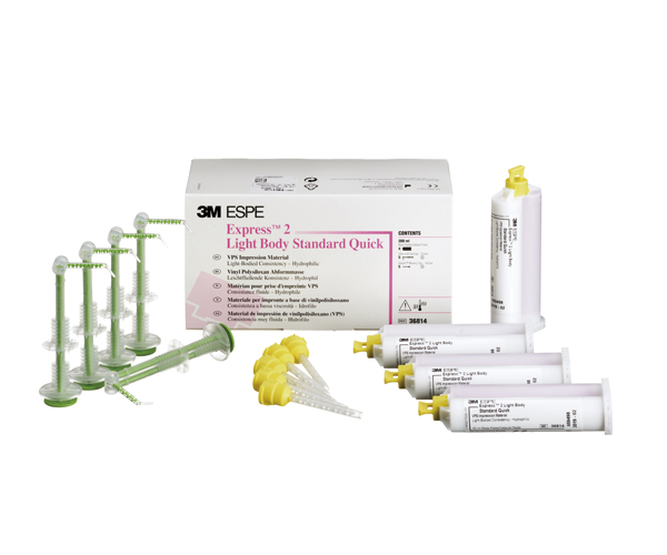 Express™ 2 la nueva generación de VPS de 3M ESPE ofrece las condiciones de partida ideales para obtener impresiones de precisión máxima y un gran ajuste en las restauraciones indirectas. Disponibles en una serie de viscosidades diferentes – de “putty” a ultrafluida los VPS de toma de impresiones de la línea Express 2 ofrecen unas ventajas fundamentales para la técnica de toma de impresiones en uno o dos pasos. Todas las siliconas pesadas Express 2 son mezcladas de forma automática en la unidad Pentamix CONTENIDO : 4 cartuchos Express™ 2 Light Body Standard Quick de 50 ml 10 puntasde mezclado Garant™ amarillas 1 instrucciones