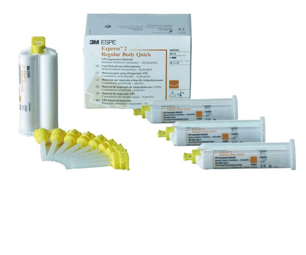 3M ESPE presents the next generation of vinyl polysiloxanes (VPS) for impression taking using one or two-step techniques. The new Express™ 2 impression materials, available in different viscosities, exhibit all the necessary characteristics for an excellent fit of the definitive restoration: they accurately capture the margin of the preparation and maintain their shape after being removed from the patient's mouth, with a recovery of nearly 100%. The new Express™ 2 product family offers a complete range of heavy and fluid silicones for automatic mixing with normal or fast setting. The fluid silicones of Express™ 2 are highly hydrophilic and possess excellent flow properties while maintaining sufficient resistance to overflow. CONTENT: 4 Express 2 Regular Body Quick cartridges of 50 ml, 10 yellow tips.