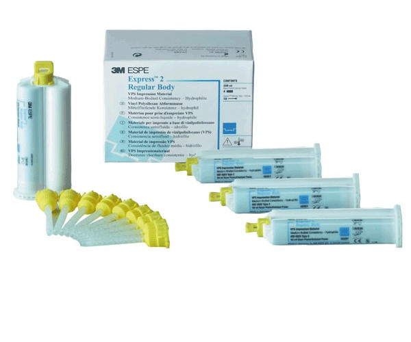 3M ESPE presents the next generation of vinyl polysiloxanes (VPS) for impression taking using one or two-step techniques. The new Express™ 2 impression materials, available in different viscosities, possess all the necessary characteristics for an excellent fit of the definitive restoration: they accurately capture the margin of the preparation and maintain their shape after being removed from the patient's mouth, with nearly 100% recovery. The new Express™ 2 product family offers a complete range of heavy and fluid silicones for automatic mixing with normal or fast setting. The fluid silicones of Express™ 2 are highly hydrophilic and exhibit excellent flow properties while maintaining sufficient resistance to overflow. CONTENT: 4 Express 2 Regular Body cartridges of 50 ml. 10 yellow Garant tips.