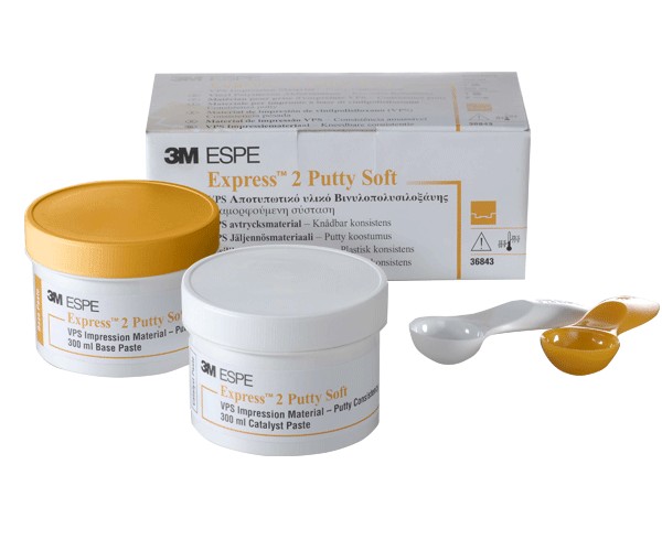 3M ESPE presents the next generation of vinyl polysiloxanes (VPS) for impression taking using one or two-step techniques. The new Express™ 2 impression materials, available in different viscosities, possess all the necessary characteristics for an excellent fit of the definitive restoration: they accurately capture the margin of the preparation and maintain their shape after being removed from the patient's mouth, with nearly 100% recovery. The new Express™ 2 product family offers a complete range of heavy and fluid silicones for automatic mixing with normal or fast setting. The fluid silicones of Express™ 2 are highly hydrophilic and exhibit excellent flow properties while maintaining sufficient resistance to overflow. CONTENTS: 1 jar of putty 300 ml, 1 jar of paste putty 300 ml, 2 trays.