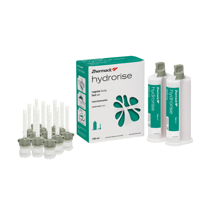 Silicona-A hiperhidrocompatible de media viscosidad para prótesis fija y removibles e implantología. Indicada para la técnica de doble impresión o de una sola fase (simultánea) con dos viscosidades. Máxima exactitud en la reproducción de los detalles - Alta resistencia al desgarro. Excelente recuperación elástica. Alta estabilidad dimensional. Vence las retenciones sin desgarrarse. Tixotrópico no gotea. Relación de mezcla 1:1. Extremamente afín al agua hiperhidrocompatible). Aroma a menta dulce (sweet mint). Color verde