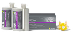 Flexitime stands out among other A silicones due to its ability to recognize the setting point through the temperature of the mouth. The handling time of Flexitime varies from 1:00 minute to 2:30 minutes, with a consistently reduced intraoral time of 2:30 minutes. Flexitime combines the advantages of fast-setting materials with those of normal-setting materials, allowing for efficient processing. CONTENT: 2 x 380 ml Dynamix Monophase + Mixing tips + Retaining ring