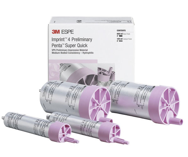 Addition silicone impression material for preliminary impressions, a substitute for alginate but with greater dimensional stability (no need to pour immediately). Replaces Position™ Penta™ VPS. Indications: the same as alginate impressions (Preliminary impression for study models and waxing of provisional antagonist whitening trays orthodontic models…). Self-mixing material for Pentamix™ Available in 2 setting versions: normal (Working time 1:30 min).
