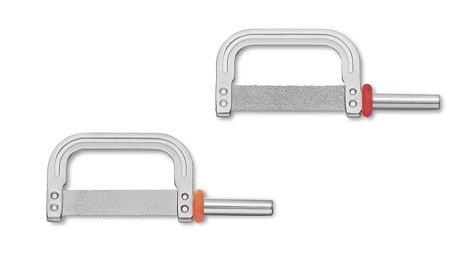 Very fine, sterilizable tools with diamond coating on both sides for interdental opening in cases of extreme stenodontia. The edge of the file is saw-shaped. Proximal enamel reduction can then be performed with stripping tools. If possible, it is recommended to use the CA ®Strip Opener only with an oscillating EVA contra-angle. 40µm, diamond-coated on both sides, orange, blade thickness approximately 0.175-0.235 mm.