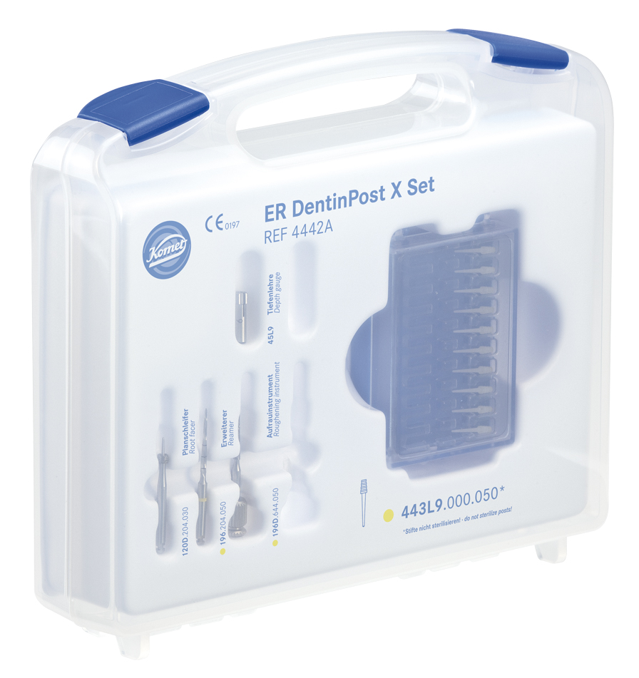 Fiber posts with composite resin for aesthetic restorations. The fibers are arranged in a parallel manner, ensuring high stability and allowing for easy removal with rotary instruments in case of retreatment. They are radiopaque and have an elasticity modulus similar to dentin. The apical portion is conical, perfectly adapting to the anatomy of the canal. The pronounced retentive head allows for a very solid reconstruction even in teeth with significant coronal destruction. Translucent material that allows for cementing the post with dual-cure or self-curing composite. The kit contains 10 posts plus 5 burs: 196.204.050 (1 unit), 120D.204.030 (1 unit), 196D.644.050 (1 unit), 45L9.000 (1 unit), 443L9.000.050 (1 unit).