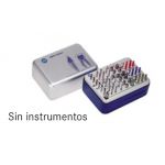 Conjunto de Postes radiculares ER com cabeça de titânio puro. O kit contém 10 unidades de parafusos: 228L9.000.070 (5 unidades) e 228L12.000.070 (5 unidades), 3 unidades de brocas: 183LB.204.070 (1), 120D.204.030 (1) e 196.204.070 (1), e 2 limitadores: 45L9.000 e 45L12.000.