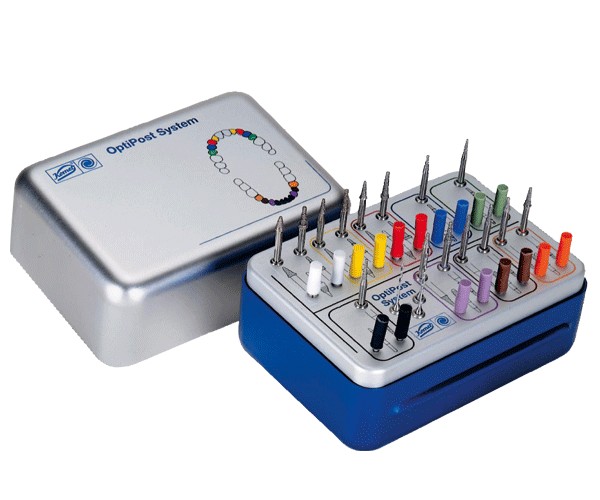 Optipost is a fast and secure root post system for the restoration of damaged crowns in previous canines and premolars. Optipost combines the advantages of cast posts with the speed and ease of application of prefabricated posts. Made of pure titanium. CONTENT: Metal box for the Optipost system. Without instruments.